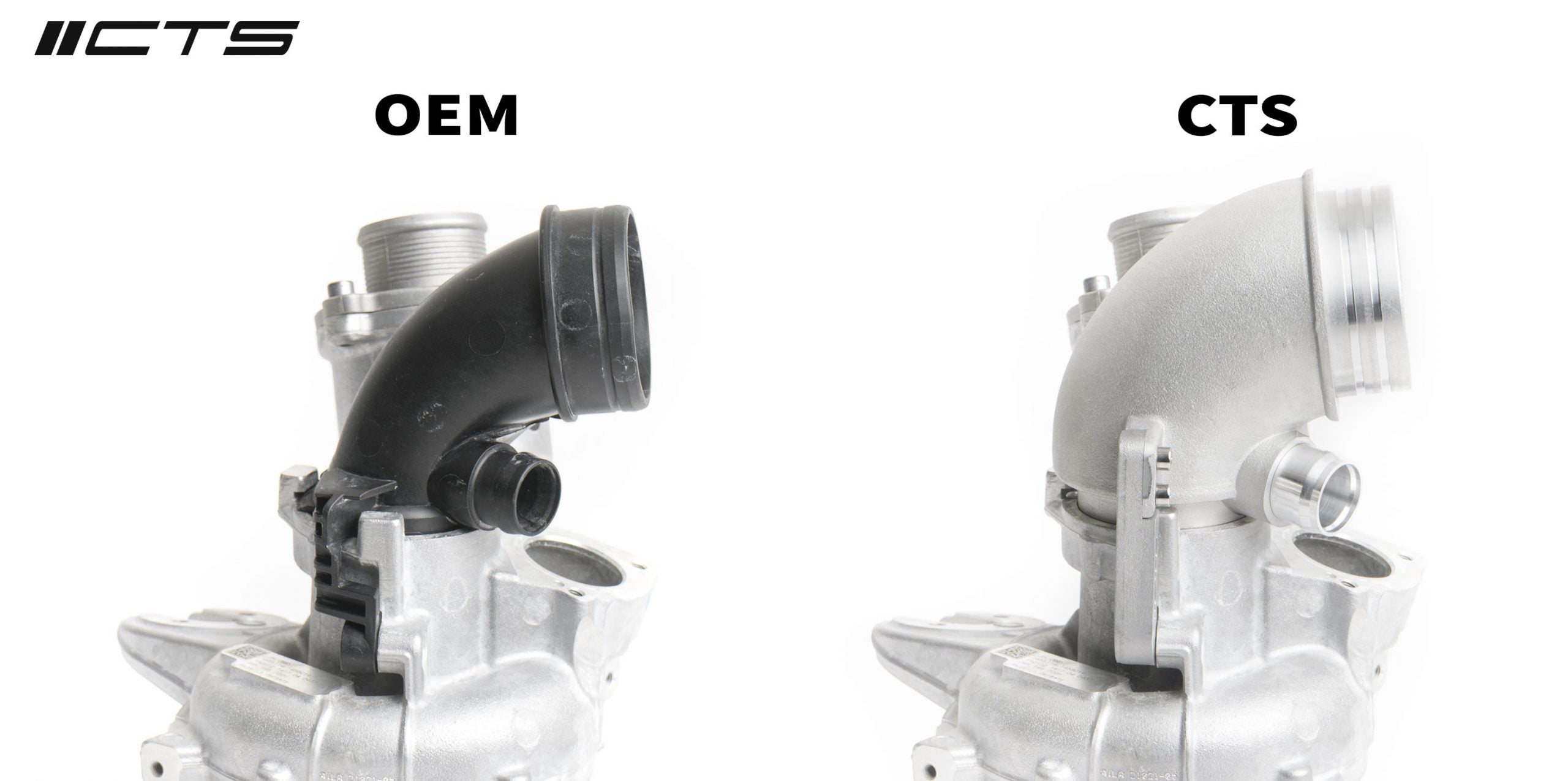 CTS Turbo is proud to announce our High Flow Turbo Inlet. We were the first manufacturer to offer these; and now they are made from cast aluminum!nnThis part is compatible with any MQB vehicle, regardless of engine displacement or factory turbocharger size. It is compatible with any intake system, be it factory stock or aftermarket.nnSimple installation takes 10 minutes and can be done using basic hand tools.nnDon’t let your free-flowing intake taper into a small restrictive factory inlet. Upgrade to CTS Turbo High Flow Turbo Inlet and make sure you get the most airflow to your turbo!nnProduct features:n