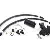 This kit uses the Integrated Engineering billet recirculating catch can, which features our state-of-the-art baffle system to catch the oil mist and not let it pass back into the turbo inlet. This flawless catch can is fully serviceable, easily disassembling if needed. Draining the catch can is simple with the use of the included T handle drain valve- simply unbolt the single bolt holding the can and open the valve to drain the liquid out. This beautiful piece is finished with a bright black anodize finish, which maintains a stealthy appearance while looking great in your engine bay.