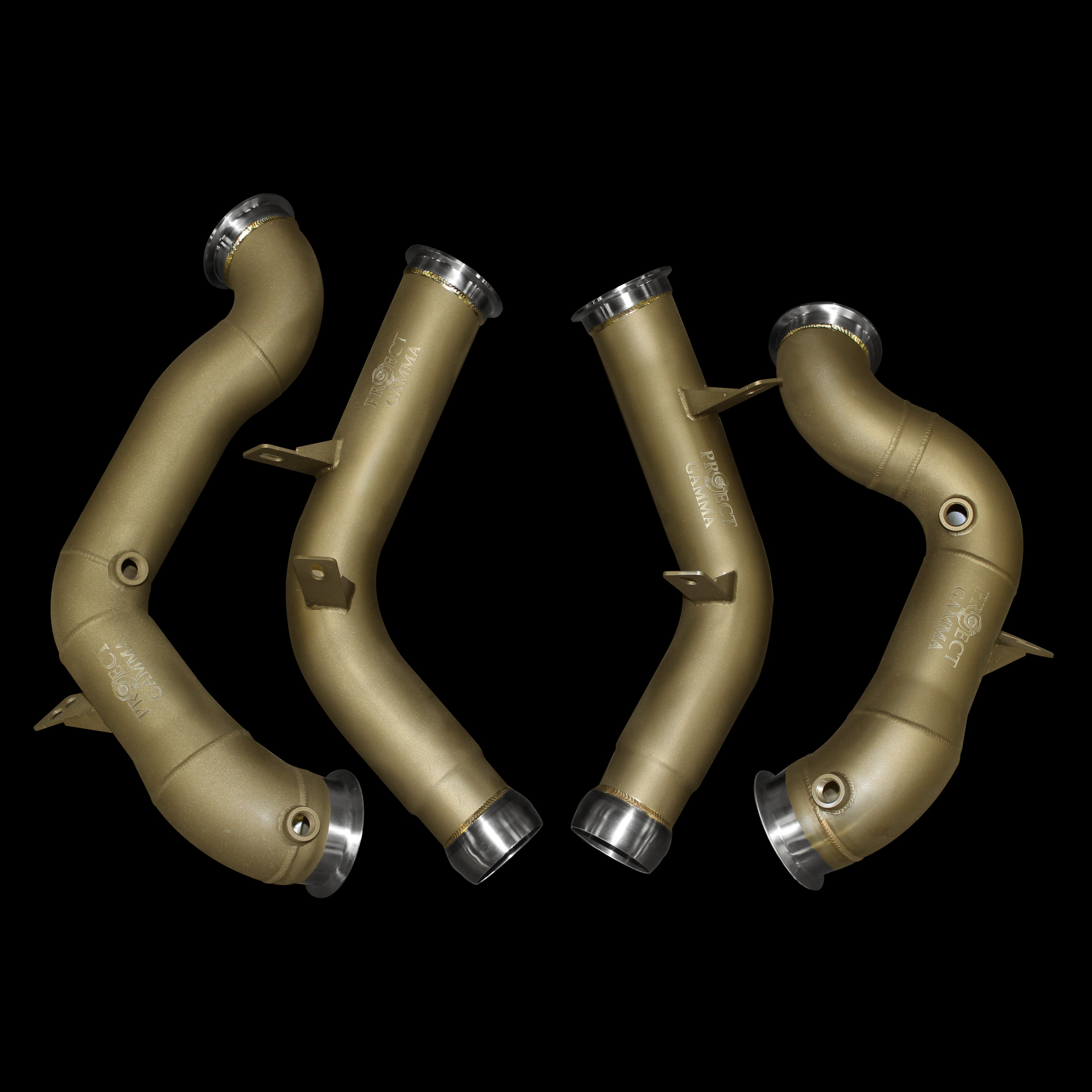 Project Gamma downpipes for the AMG GT63 / GT63S models feature a 4 to 3” construction along with a stainless steel v-band to pipe transition that is machined with CNC to precision. Our downpipes are the best bang for your buck mod available for your AMG GT63 / GT63S with gains from 50 Horsepower and 60 Torque when tuned. Rather than necking down closer to the turbos like most of our competitors, our downpipes present a full 3D design up to the last inches proving a greater increase in flow. These downpipes allow for cooler temperatures in the engine bay with the addition of heat shielding. Project Gamma downpipes are handcrafted to extreme rust resistance using 304 Stainless Steel.