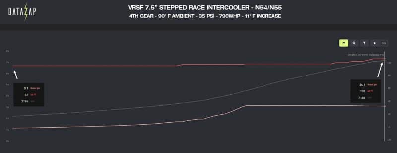 The VRSF Intercoolers are the most proven, affordable options that will lower intake temps on a full bolt on car without compromise. With the 5″ Performance Stepped HD intercooler you can expect to see an 0-3 degree rise during a 3rd gear pull on a stock turbo, where the 7″ Competition HD Intercooler will show a decrease in starting temperature. In comparison, the OEM intercooler rises about 32 degrees during the same 3rd gear pull.